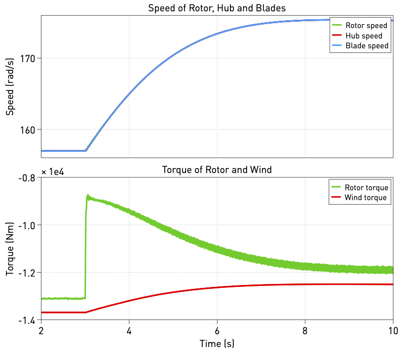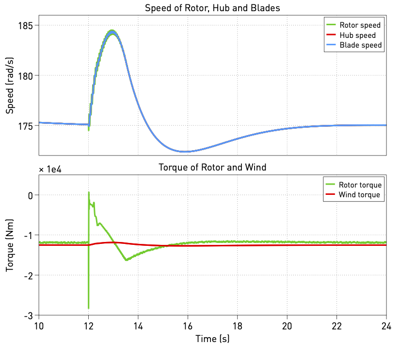 Acceleration: At \(3\, {\mathrm{s}}\) the rotation speed of the turbine is accelerated to \(175\,\mathrm{rad}/\mathrm{s}\) via a step jump on the reference input of the speed controller, to achieve maximum power generation under the given wind speed of \(12\, \mathrm{m/s}\) As mentioned previously, the external MPPT loop utilized in a practical implementation is not present in this model. The step change of the speed reference is just a fictional one which sets up the machine for an extreme test case to prove the system’s stability.