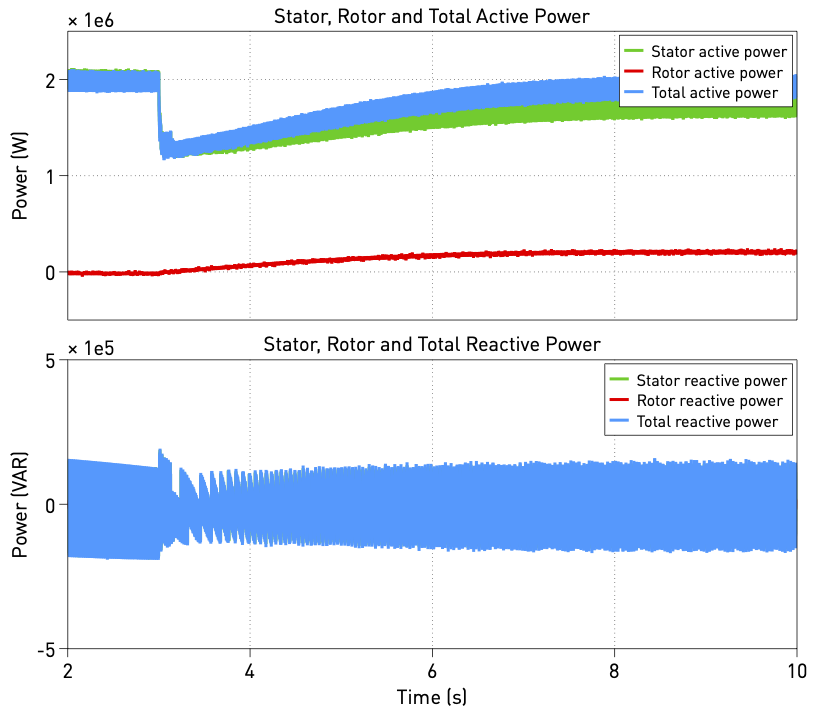 Initial state: At the simulation start the generator operates at \(157\,\mathrm{rad}/\mathrm{s}\), which is synchronous to the grid frequency. Most of the generated active power is injected into the grid via the stator winding of the induction machine, while due to the zero slip condition, virtually no power flows through the rotor except for the resistive losses. The reactive power generation is not activated yet at this stage.