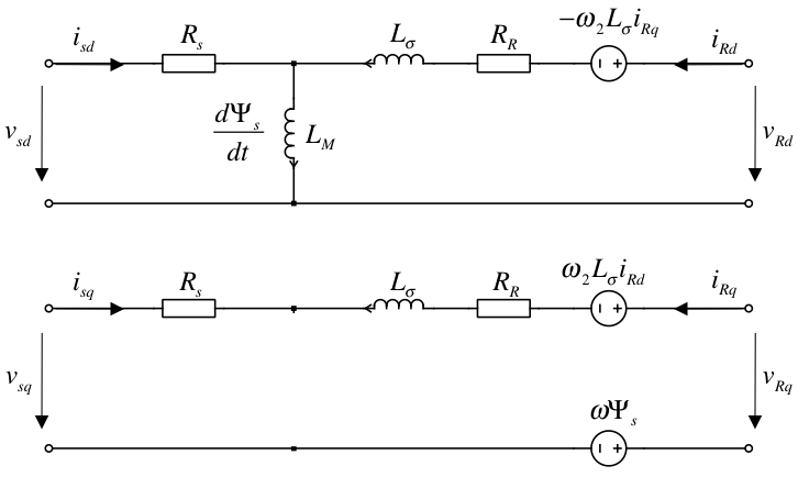 Note that the stator leakage inductance has been eliminated in the equations above, due to the fact that the stator flux is selected as the reference vector. Graphically the state-space model can be expressed as a circuit schematic for the d- and q-axis, respectively, as shown in Fig. 13. By substituting the equations for the stator voltage and flux linkage into the one for the rotor voltage, we find that: