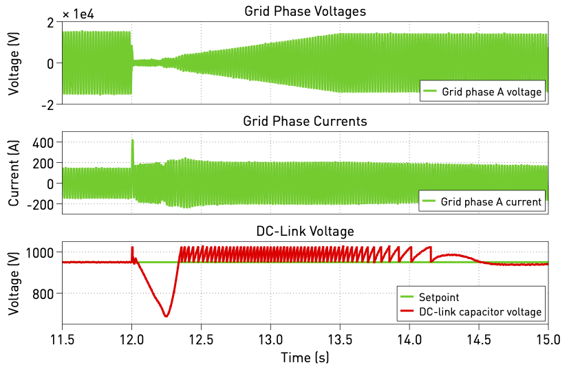 As a result, the current controller applies a q-axis voltage \(v_{\mathrm{Rq}}\) of opposite polarity compared to before the fault, because of the nearly zero value of the back EMF \(\omega \Psi_{\mathrm{s}}\). Hence, the active power becomes negative for a short time, and the capacitor is discharged and the voltage falls until approximately \(12.3\,\mathrm{s}\). After that, as the grid voltage recovers, the back EMF \(\omega \Psi_{\mathrm{s}}\) rises so \(v_{\mathrm{Rq}}\) changes its polarity back to what it was before the fault, and the active power becomes positive, effectively re-charging the capacitor. At this moment the grid-side inverter is still not able to transfer a large amount of power, therefore the net power flowing into the capacitor is still in surplus and the voltage rises further. Because of the chopper circuit, the voltage oscillates between the limitation and the nominal value in the following several seconds, until the grid voltage totally recovers and the grid-side inverter is again able to transfer enough power.