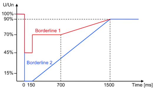 Grid fault: At \(12\, {\mathrm{s}}\) a three-phase short circuit fault occurs on the \(10\, {\mathrm{kV}}\) medium-voltage grid, which is modeled using a controllable voltage source. Three fault options regarding the residual voltage’s profile can be chosen. The first option is a \(0.2\, {\mathrm{s}}\) zero voltage sag, while the other two options are described in the 2007 German Transmission Code Standards [9], as Fig. 18 shows.