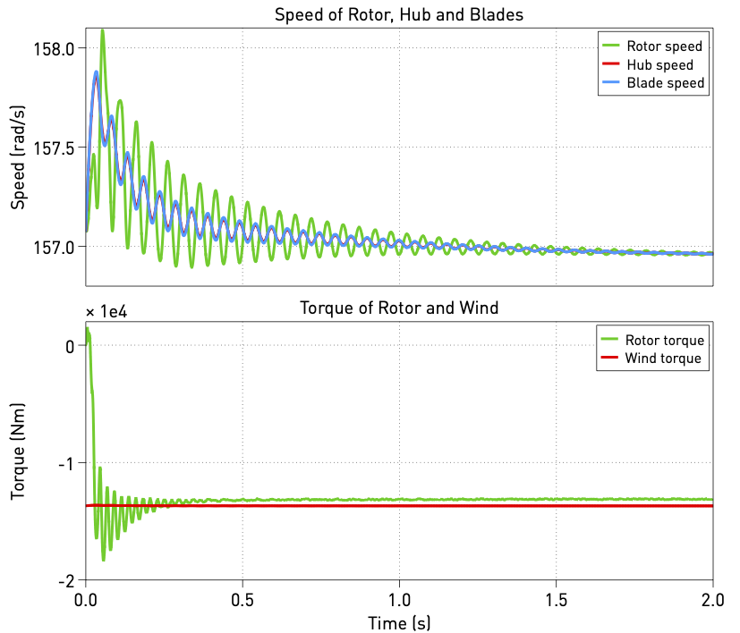 By simulating the scenarios described above, the robustness of the design is observed and improvements can be made, namely with the control techniques. The various parameters in the system are chosen to provide desirable results during the entire operating range of the turbine. At the start of the simulation, a damped oscillation can be observed due to the elastic and lossy coupling between the mechanical parts, as shown in Fig. 20.