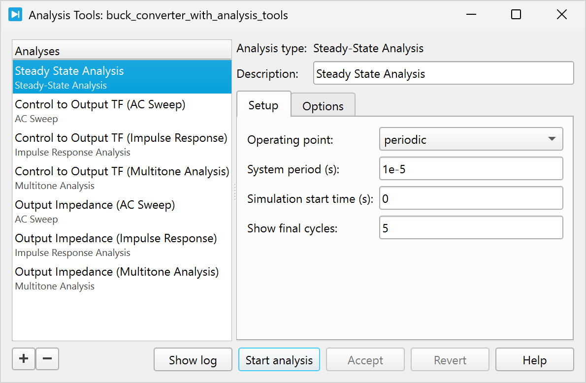 In PLECS Standalone, all analyses are managed in the Analysis Tools Dialog shown in Fig. 91. To open the dialog, select Simulation > Analysis tools… from the menu of the schematic editor.
