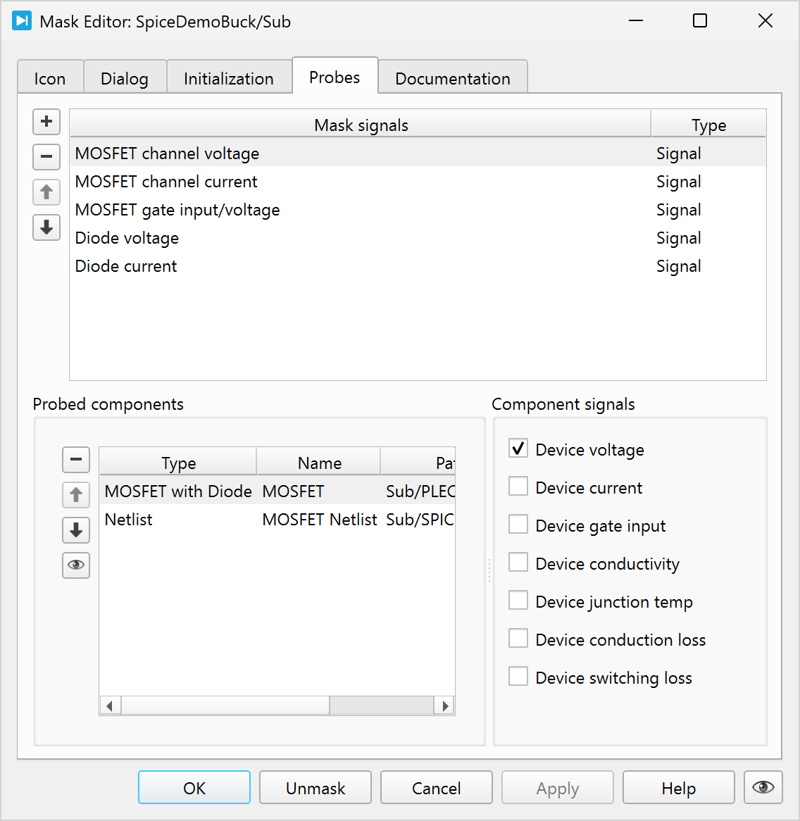 The Probes tab enables you to define probe signals for the Netlist component. These probe signals can directly be used in a Probe or in a Masked Configurable Subsystem, making it easier to switch between configurations and keeping probes valid.