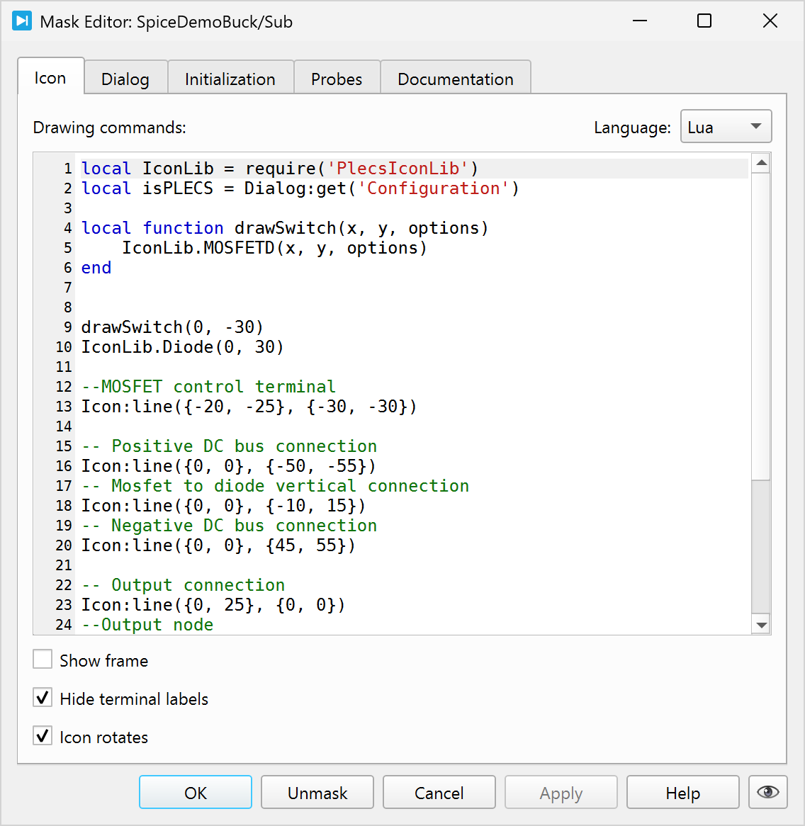 The diode icon is constructed from a triangle and three individual straight line elements and is scripted using the Lua Language.
