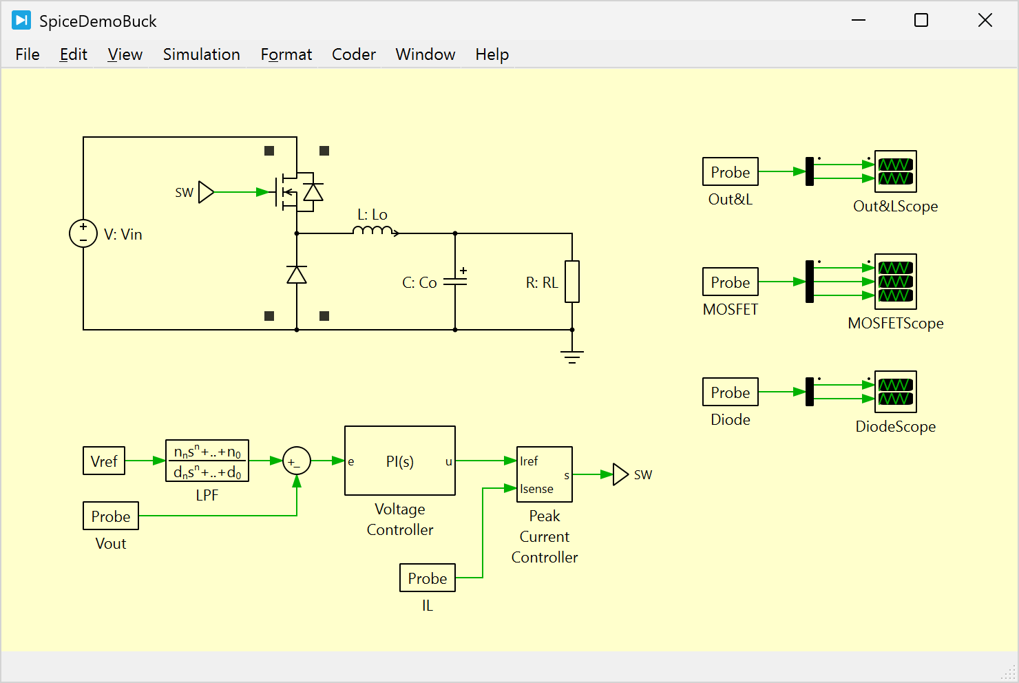 In PLECS Spice, you can directly probe voltages and currents using Voltmeters, Ammeters, and via the Probes Tab. You can use the PLECS Scope to analyze these measurements or process them via the control domain in standard PLECS.