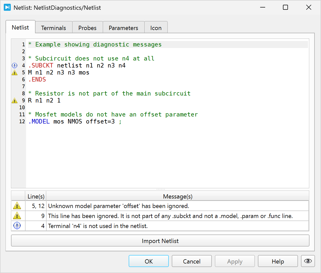 The Netlist component dialog provides five tabs for configuring a netlist, customizing terminal labels, defining probe signals, setting parameters and adding an icon.