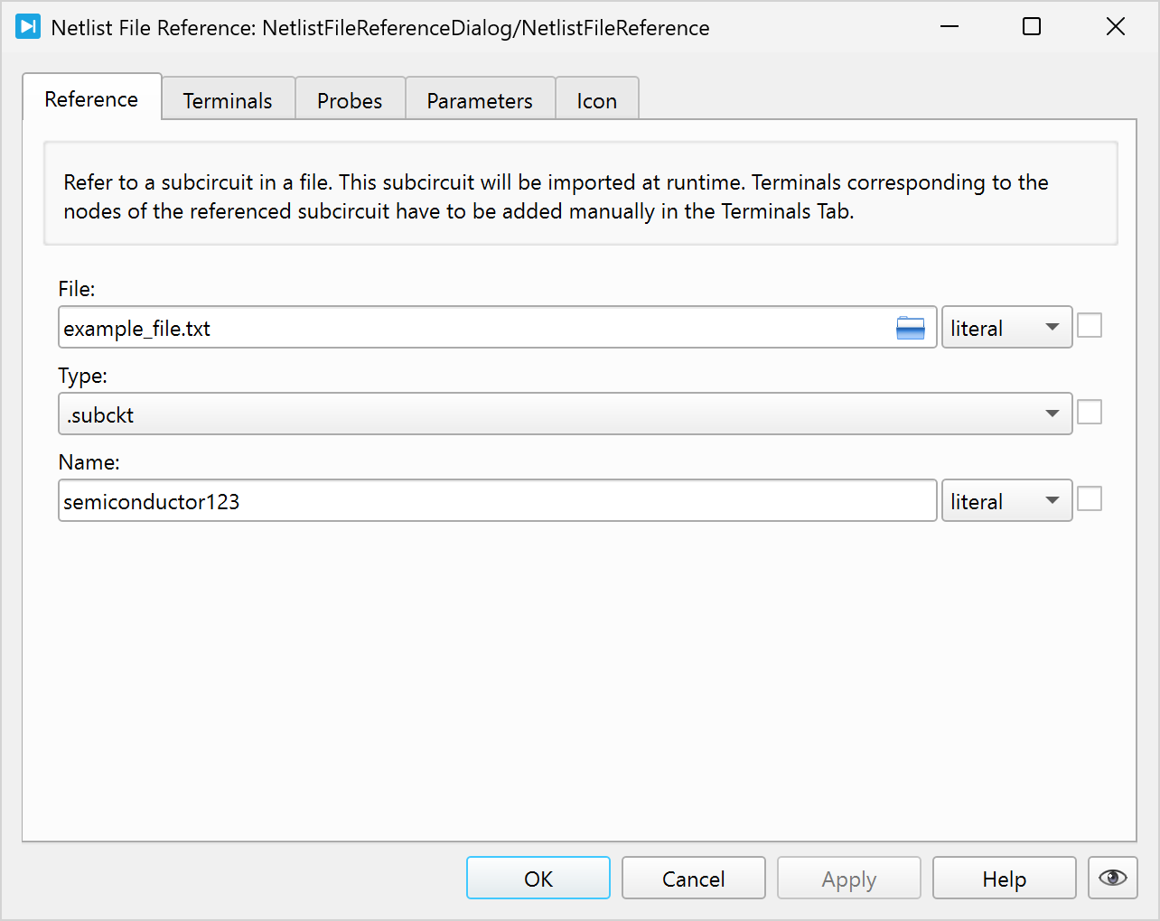 The Netlist File Reference component is a variant of the Netlist component that does not store the netlist in an editor. Instead, the netlist is imported at runtime from a file.