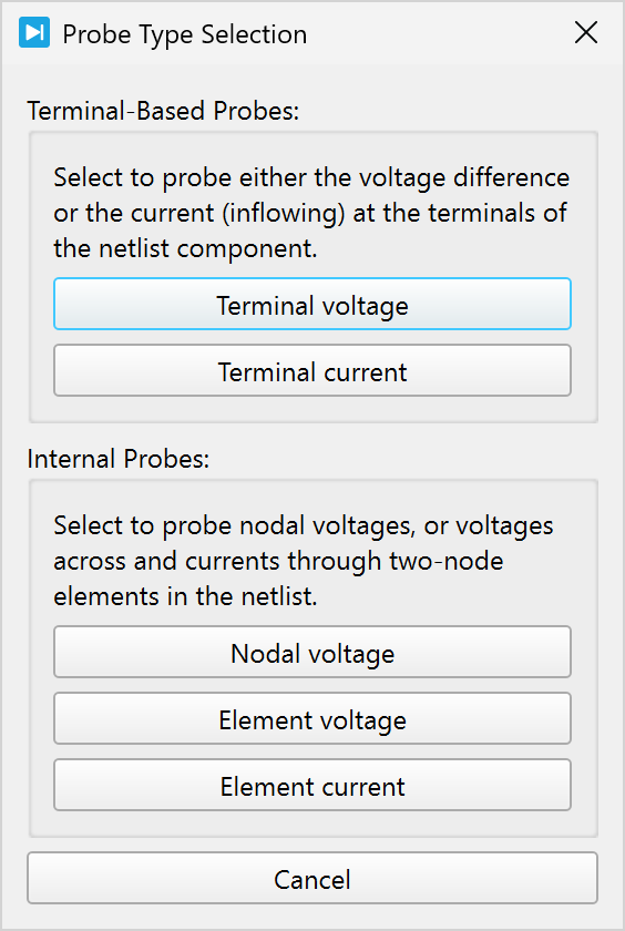 The terminal-based probes offer a selection dialog based on the terminal names in the Terminals Tab. The internal probes selection tool offers a tree view of the nodal voltages and the two-terminal elements that exist in the parsed netlist. This tree structure represents the hierarchy how subcircuits call each other.