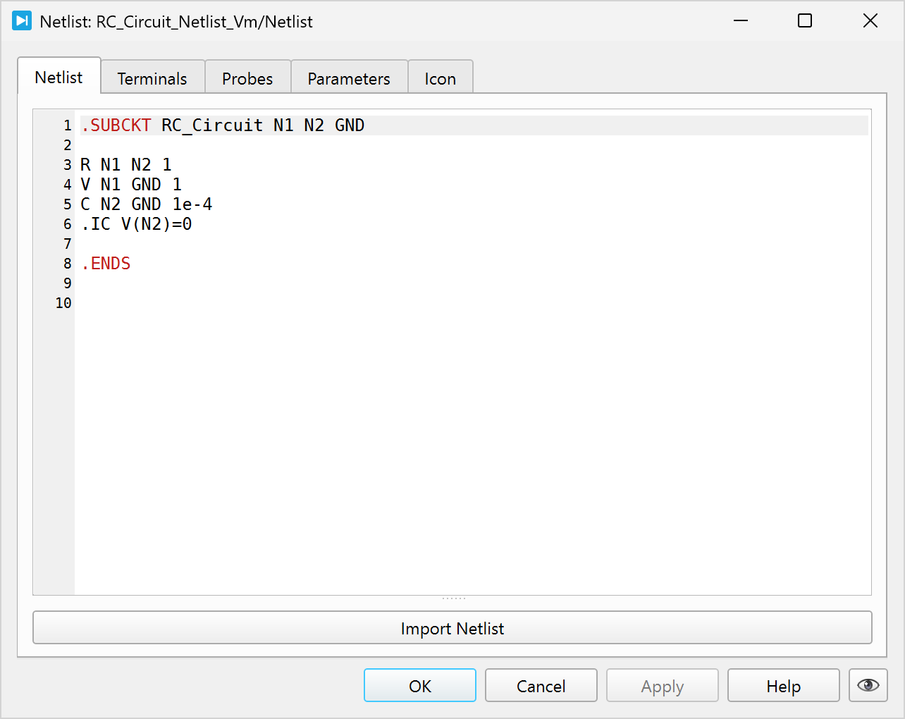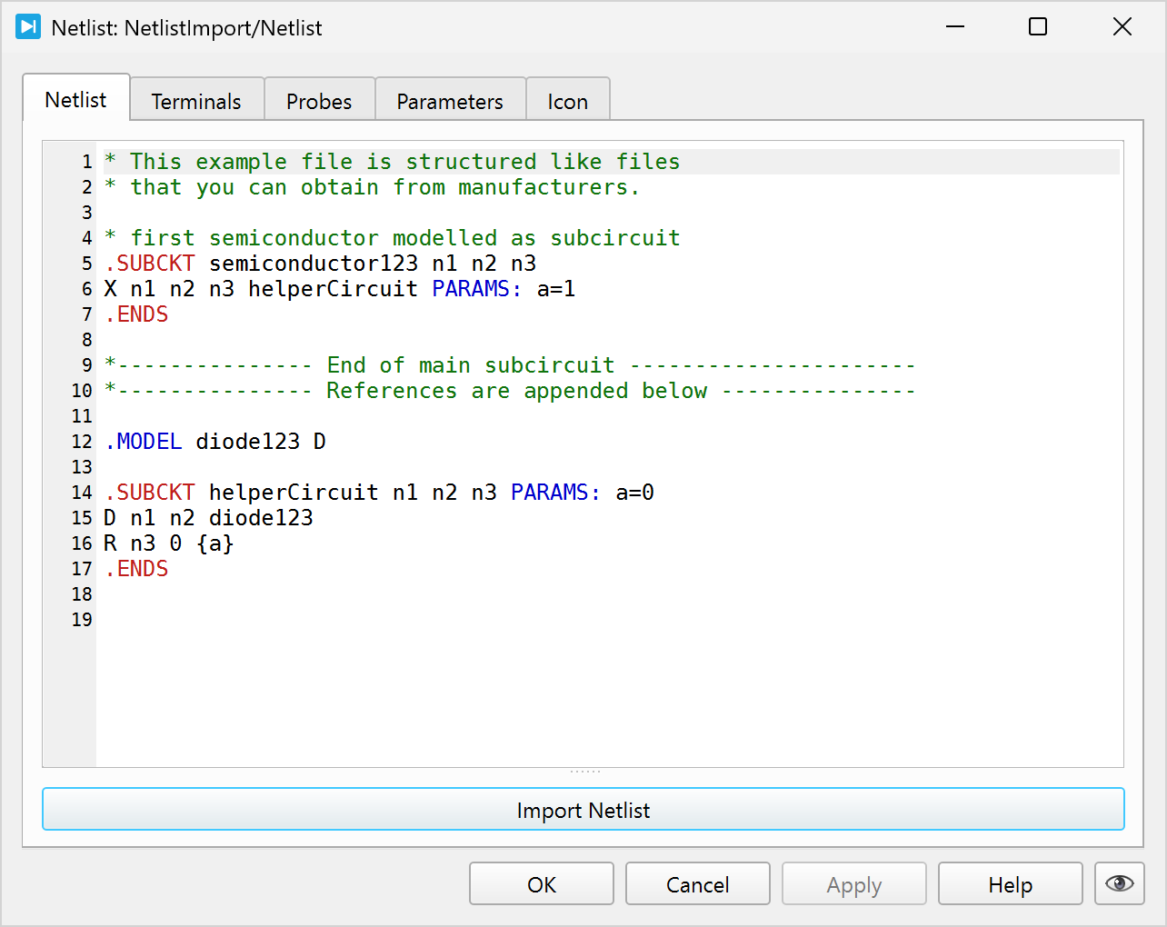 A SPICE netlist description is included in a Netlist component using the Netlist tab. It can be written/edited directly in the provided text dialog or imported form a file using using the Import Netlist button.