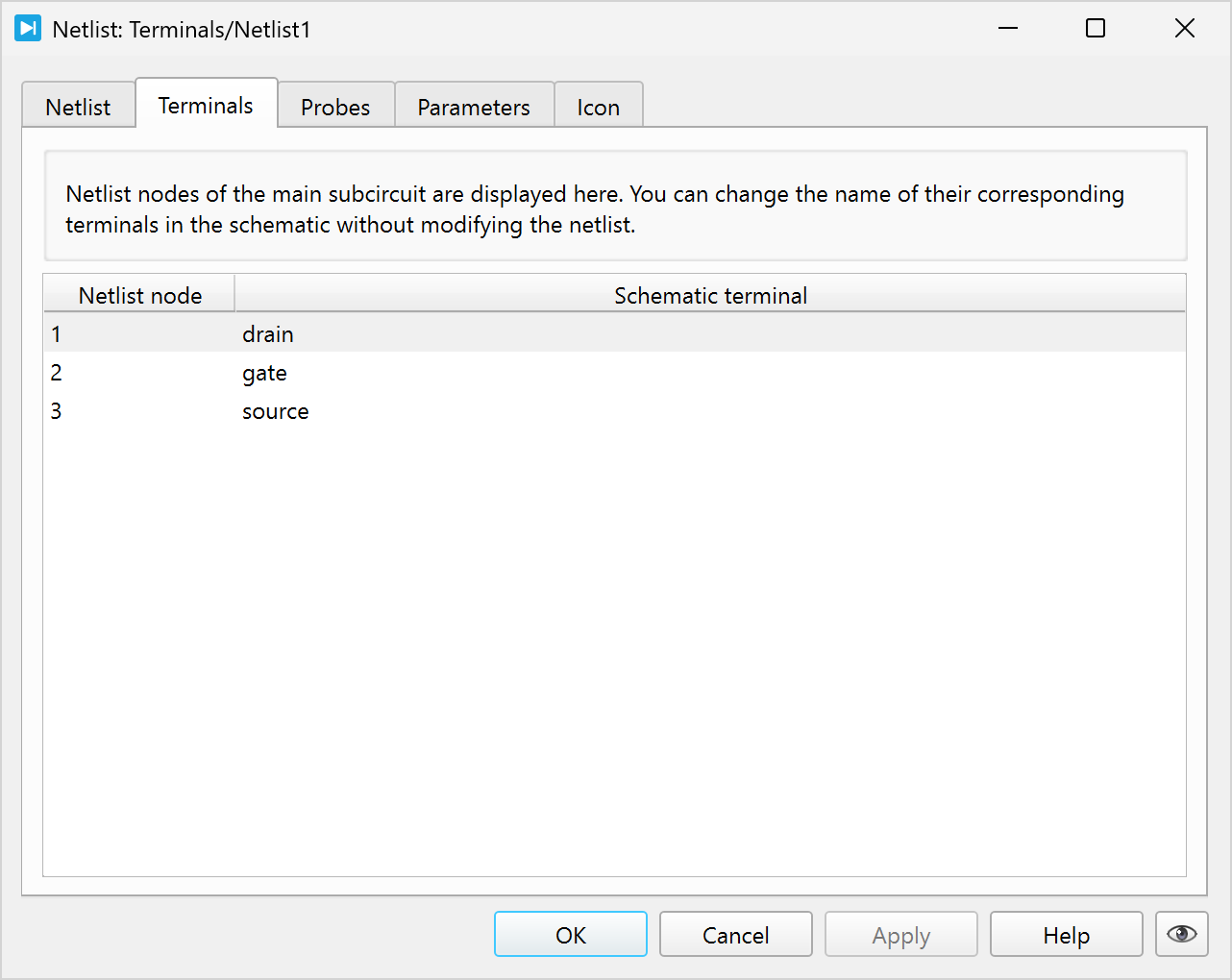 The Terminals tab allows renaming terminals of the Netlist component corresponding to exposed nodes without modifying the netlist itself. This is useful to assign standardized or meaningful names to schematic terminals.