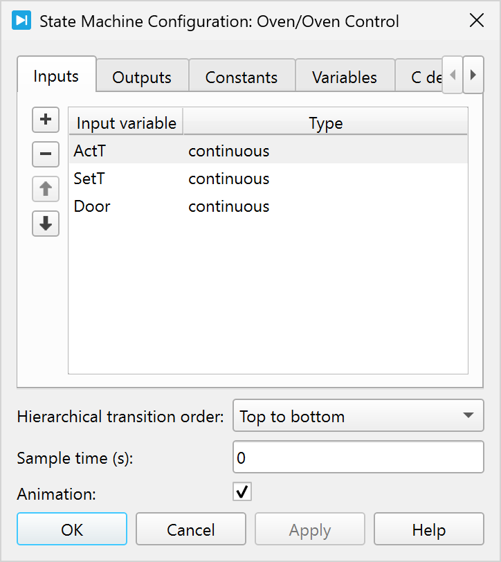 On the Inputs tab you define input signals that are fed from the surrounding system into the state machine. Input signals are specified by an Input variable and a Type.