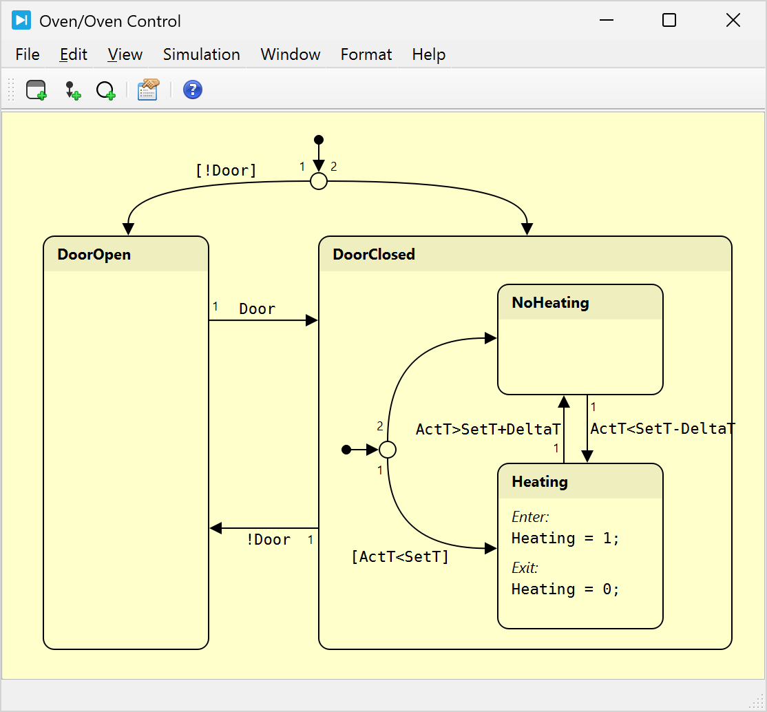 DoorClosed is a compound state. Therefore, when it is the target of a transition, its internal default transition will be executed, which is also branched with a Junction. If the actual temperature is below the set point when the default transition executes, the Heating state will be entered, else the NoHeating state. Afterwards, the state machine will transition from Heating to NoHeating when the actual temperature becomes greater than the upper limit and from NoHeating to Heating, when the actual temperature becomes less than the lower limit.