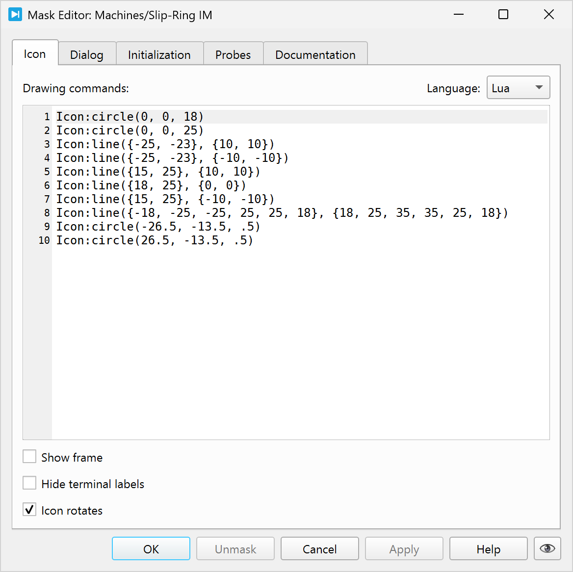 The Language selector lets you choose the programming language used for the drawing commands. Choose Lua to create dynamic icons that can change depending on user input or if you would like to make use of the PLECS Icon Library.