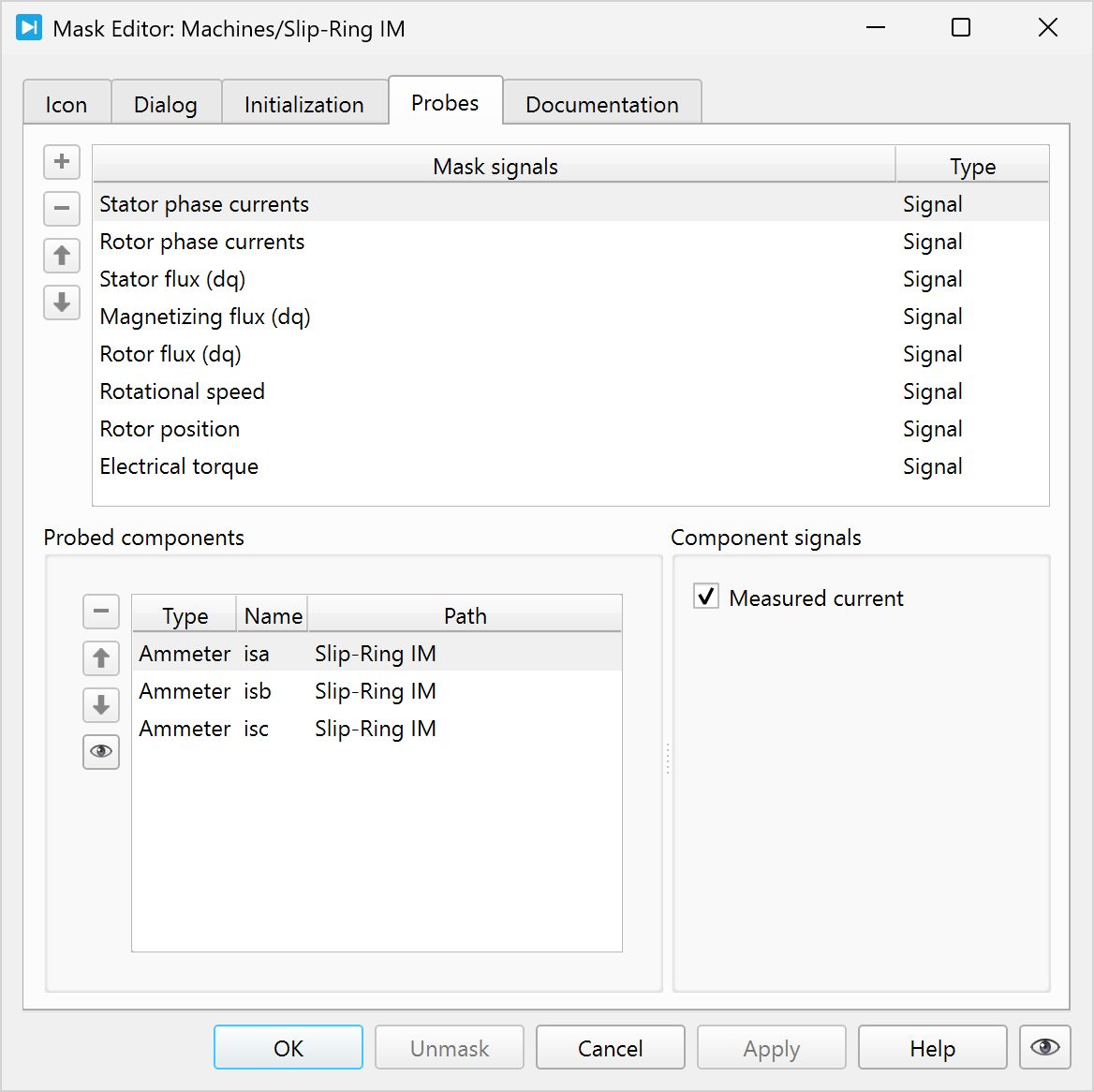 The Probes pane enables you to define the probe signals that the masked subsystem will provide to the PLECS Probe. Mask probe signals appear in the probe editor in the order they appear in the mask signal list. You can add or remove signals or change their order by using the four buttons to the left of the signal list.