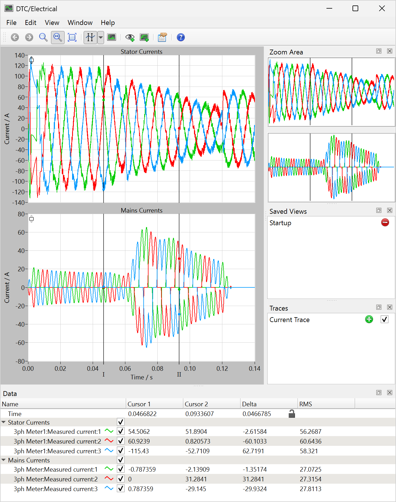 The PLECS scope is used to display simulation results and offers powerful zooming and analysis tools to simplify viewing and processing results. The PLECS scope can be placed on the Simulink worksheet or in the PLECS circuit. The appearance of the PLECS scope is depicted in Fig. 45. The scope contains a plot area and optional Zoom Area, Saved Views, Traces and Data windows.