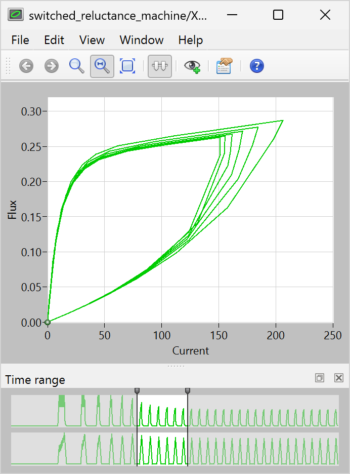 The time range can be modified by moving its left and right boundary. The inactive time range is grayed out. By clicking into the time range, the active time range can be shifted without changing its length. Any change of the time range is reflected in the XY plot immediately. If vectors are drawn, the right end of the time range determines the position of the vector head.